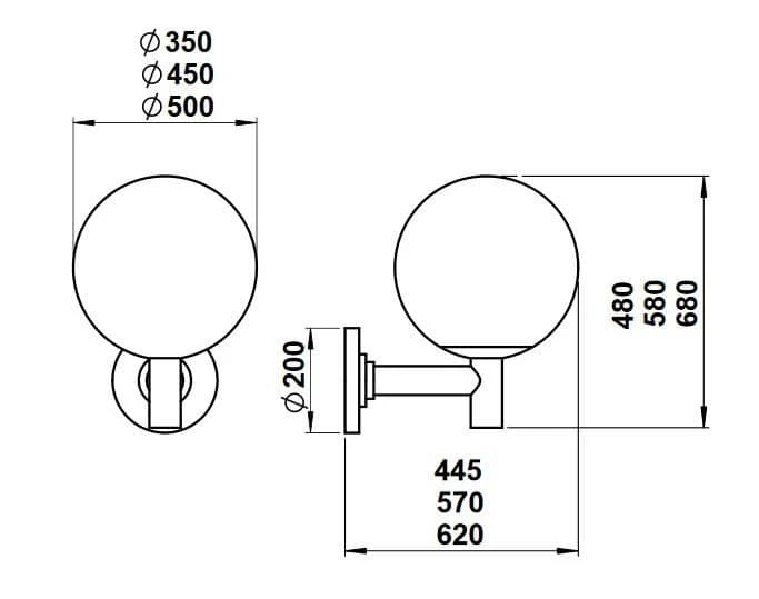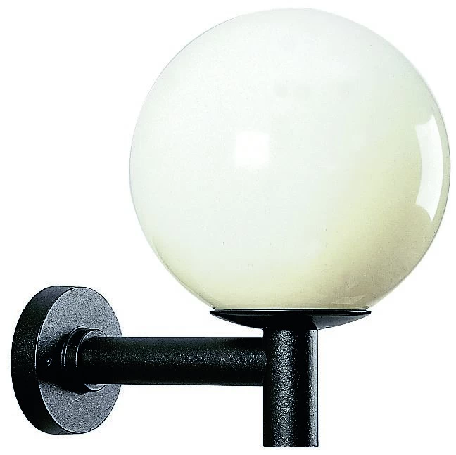 Wandleuchte für Terrasse und Garten mit weißer Kunststoffkugel.
