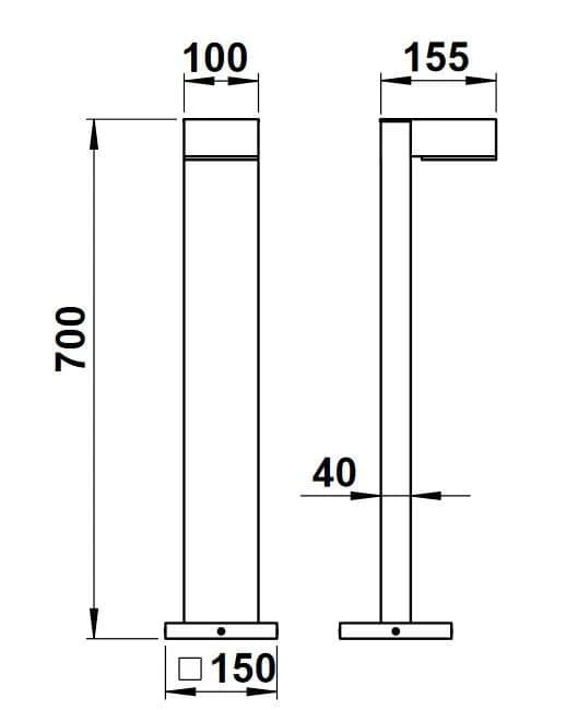 Abmessungen: Höhe: 700 mm, Leuchtfläche Ø100 mm, Länge: 155 mm