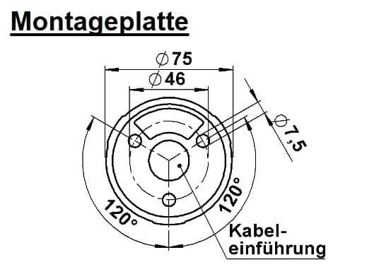 – 3 Befestigungslöcher Ø7,5mm, 120° versetzt auf Lochkreis ø46mm
