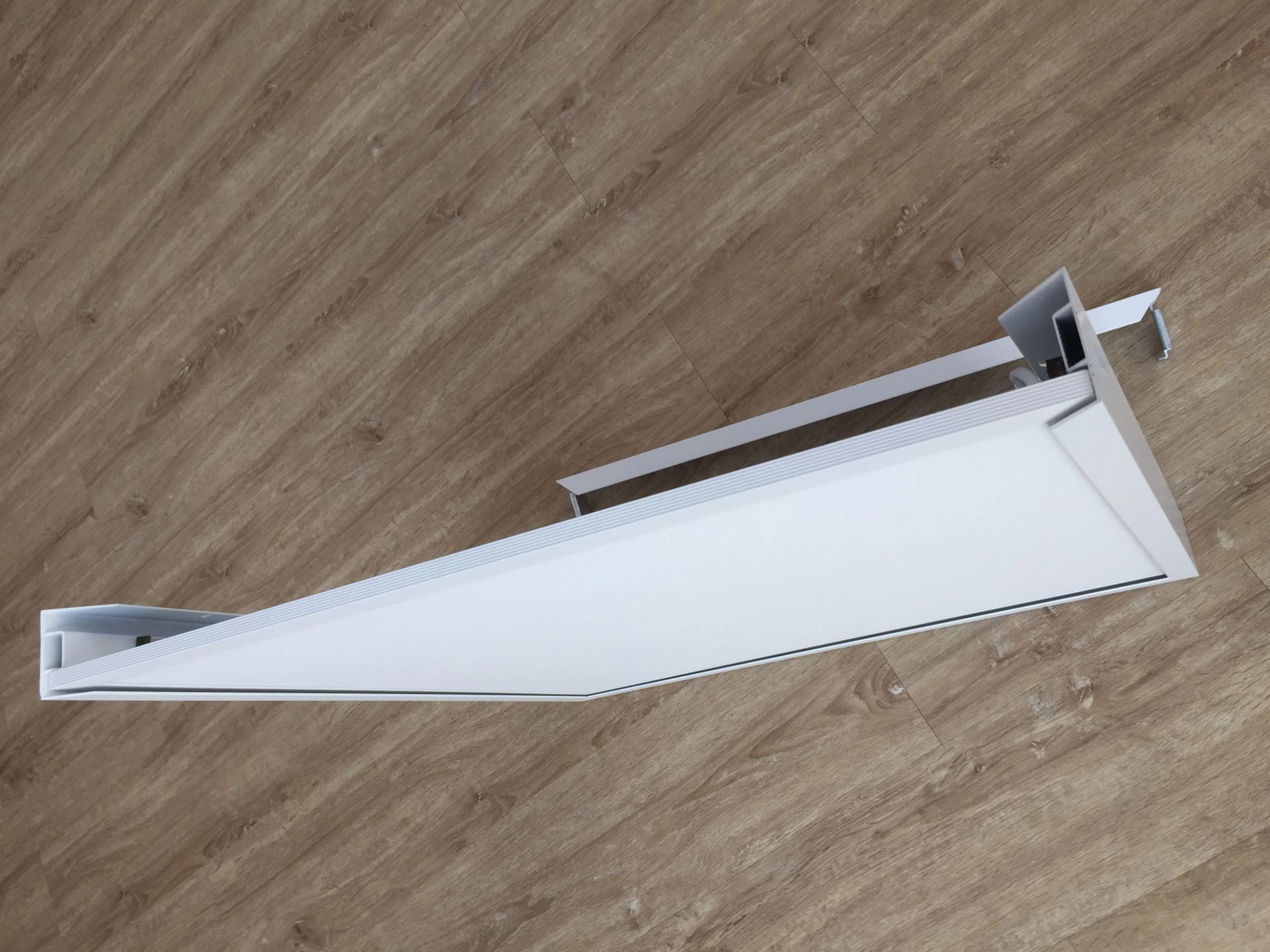 Er wird zunächst an der Decke befestigt und läßt sich an einer Seite öffnen, so dass das Panel einfach in den Rahmen geschoben werden kann. Danach wird die offene Seite wieder verschlossen.