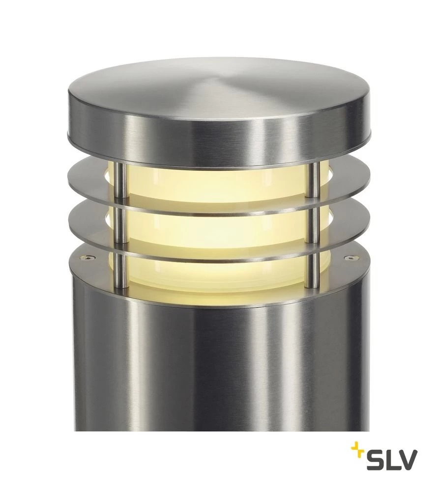 Runde Stehleuchte gefertigt aus witterungsbeständigem Edelstahl zum direkten Anschluss an 230V Netzspannung.