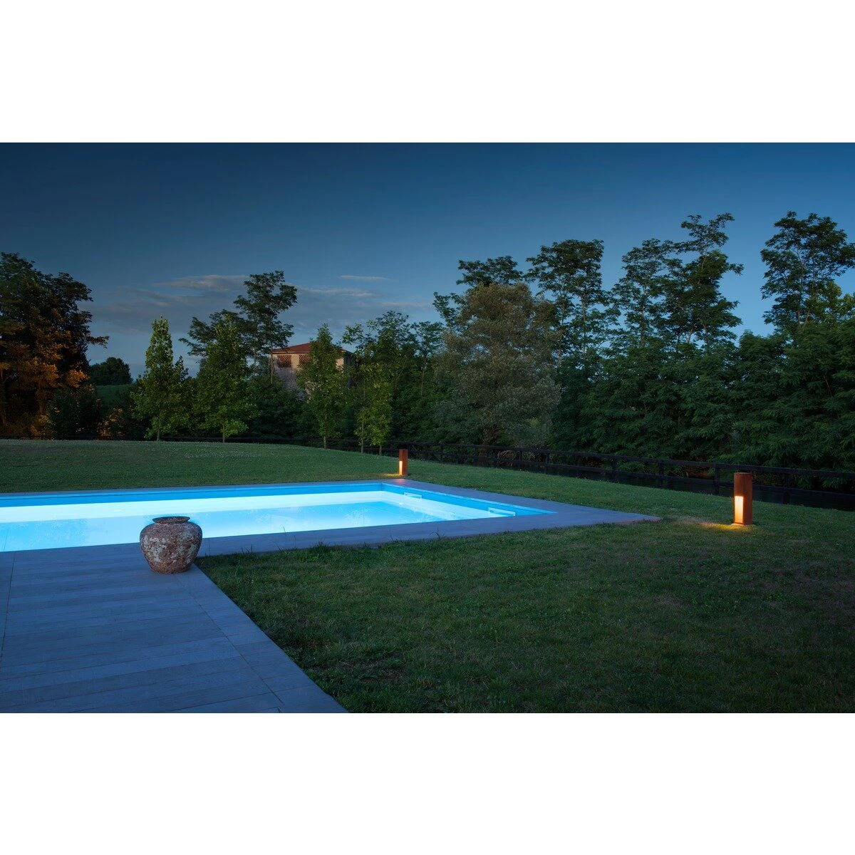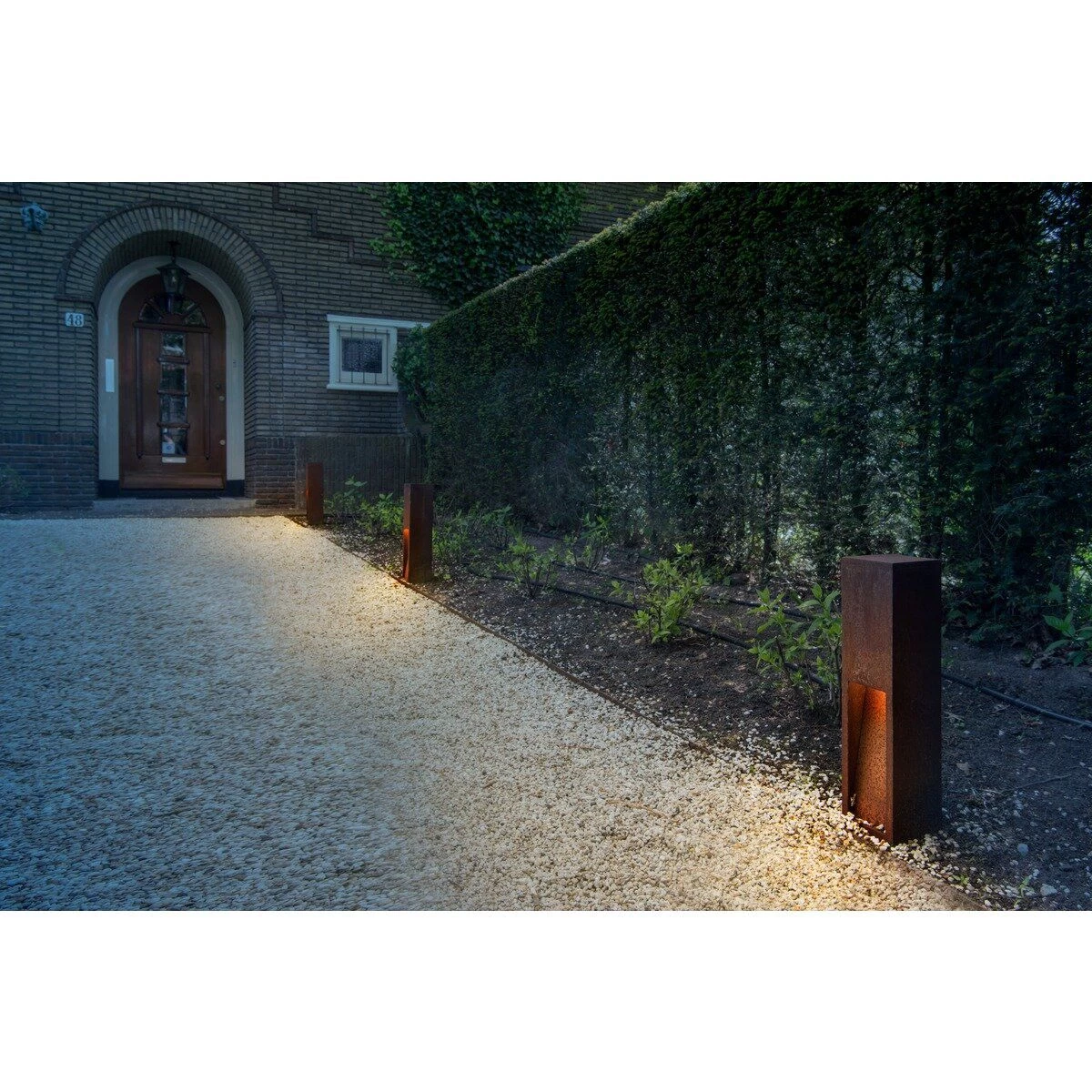 Ein Zusammenspiel zwischen dem verwendeten FeCSi-Stahl und den Witterungsverhältnissen, sorgt auf der Oberfläche der Leuchte für eine kontrollierte Rostschichtbildung.